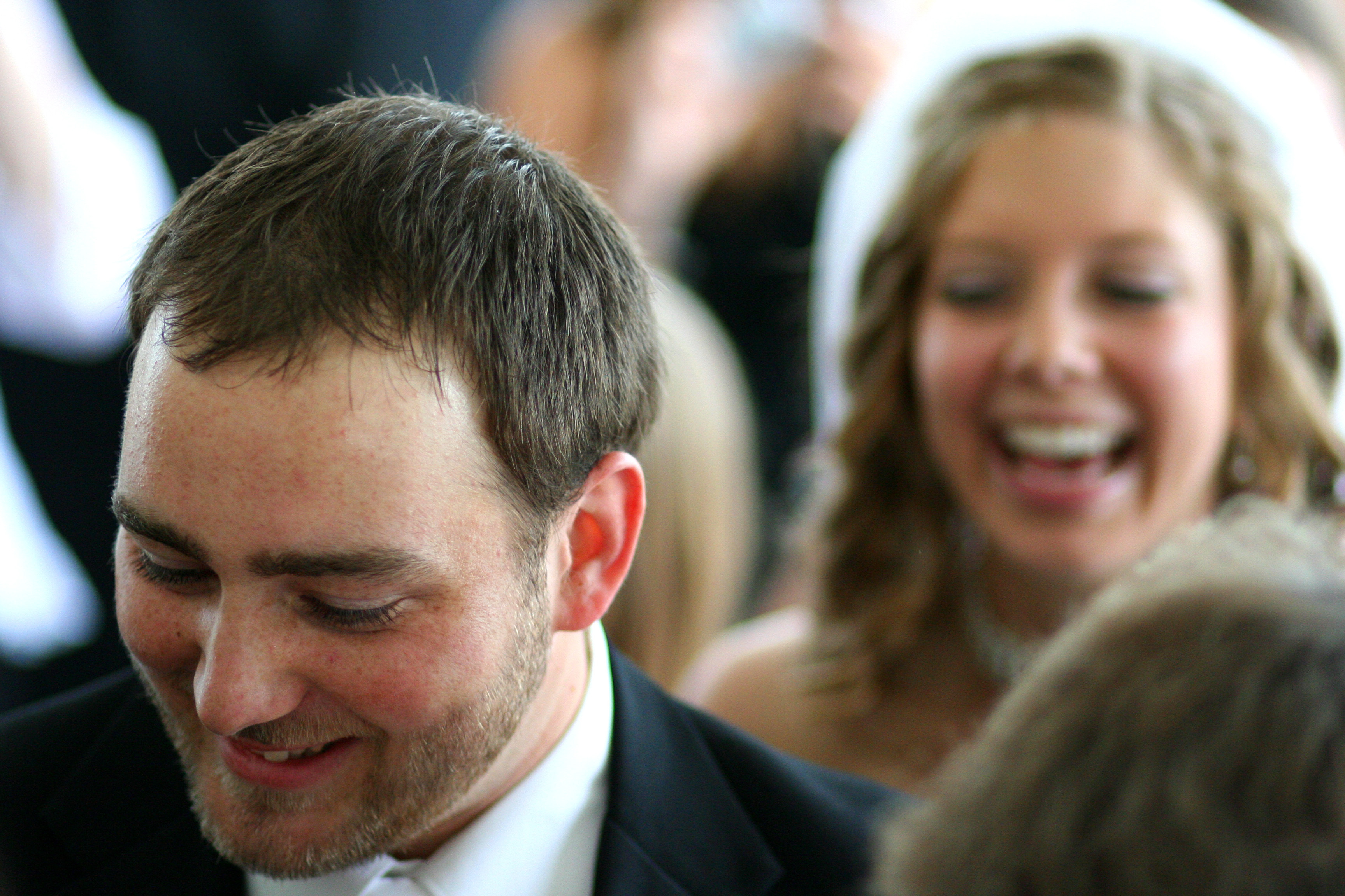 Description: One of my amazing friends and his bride on their wedding day. This was my first day of shooting with my new camera, a Digital Rebel XT and I loved every second of it. The camera preserved so much detail in the photos. You can see the groom here, leading the bride back into the church. The main light was behind them, but mostly blocked by the people around, and the light bouncing off the wall was enough to grab this shot. The small aperture isolated the two, in their blissful moment. All I can say is congratulations.