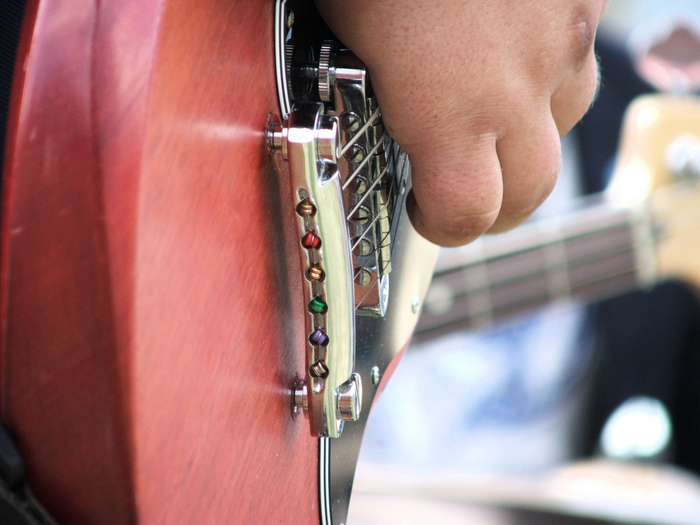 Some say only those with perfect pitch can see color in sound. I disagree, and you can see why. At Cornerstone Music Festival there was a band, two red heads and a guy in a blue jacket, all with red guitars, a blue drumset, and a lead singer dressed in grey. The colors were wonderful, and so was the music. While I was watching I saw that one of the guitarists had a rainbow of colors on the ends of hist strings. It provided a perfect opportunity for a photo. I love the idea of different notes having different color, and this demonstrated it wonderfully.