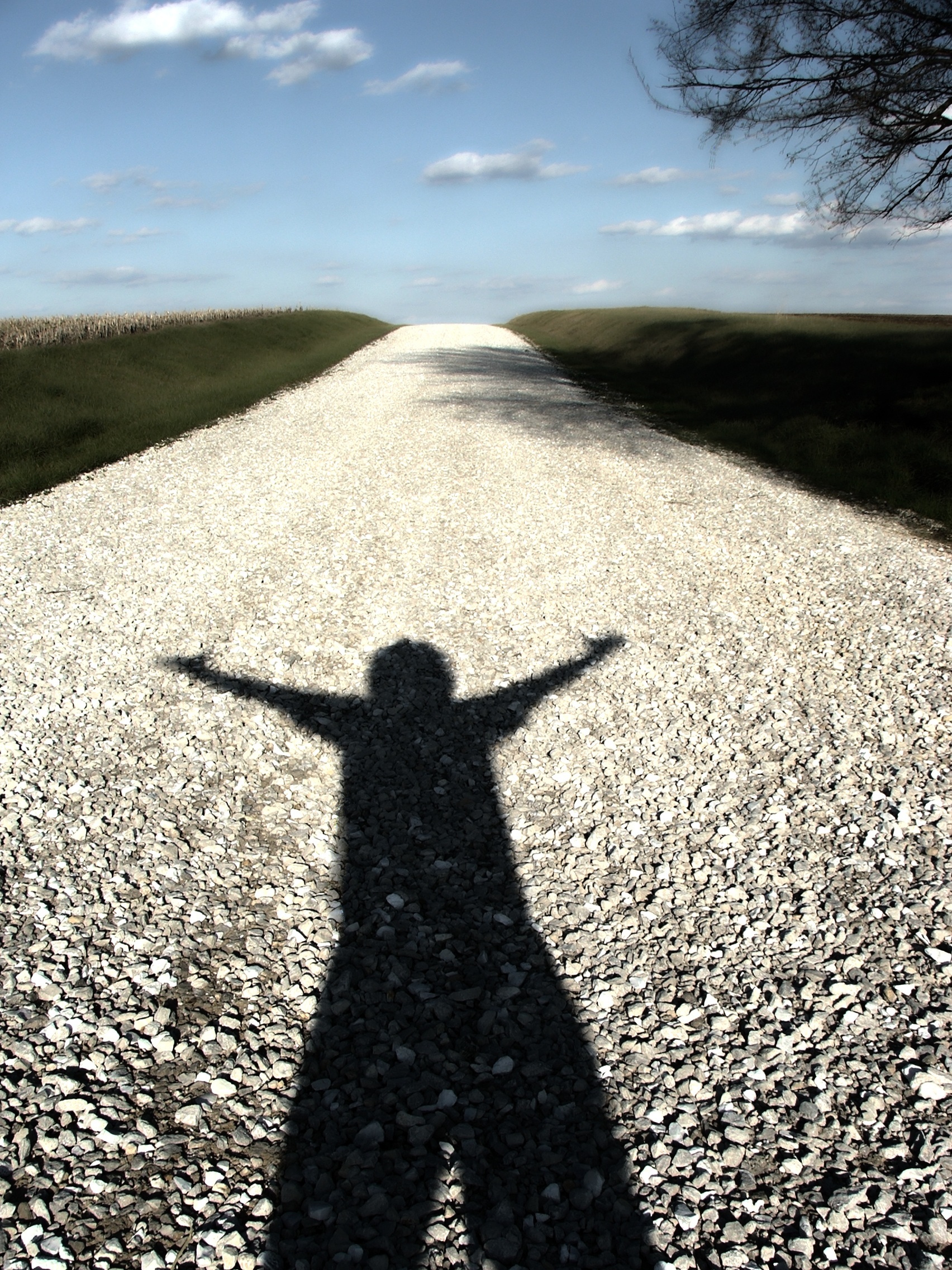 Glosoli. There is a vast amazing world around us and we need to stop and enjoy it. In this photo there are many things to take in. The first is the vastness of the world, there is so much space, and the subject is reveling in that thought. The open sky, and open road, both lend themselves to this thought. There is also the thought of the future, our journey. The subject is not moving, but overjoyed just to be on the road. Its obvious that the subject does not care where the end of his journey is, but that he is on one. There is a graduation, from dark to light, as the road travels onward. It relates to the past moving towards the future. There is no hope in the past, only hope in that which is to come. The dreamy, soft look of the photo adds to its appeal to thoughtfulness. -Me