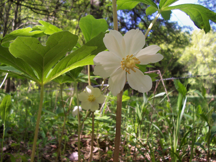 These three white flowers lined up for their photo shoot and turned out nicely. The lines in this picture make it a nice view. The three white flowers, the wire, the stems. Look Closely for the third flower.